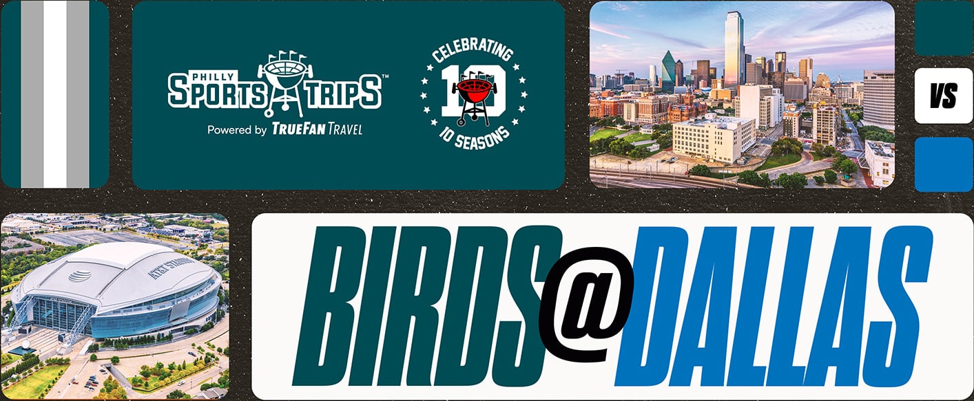 The full travel package has everything covered: direct flight from Philadelphia to Dallas, charter bus airport transfers, a hotel stay in Fort Worth, an exclusive Birds pep rally, an all-inclusive tailgate party, meet & greet with Philadelphia Eagles alumni, round-trip transportation to the stadium, and your ticket to watch the Eagles take on Dallas on their home turf.