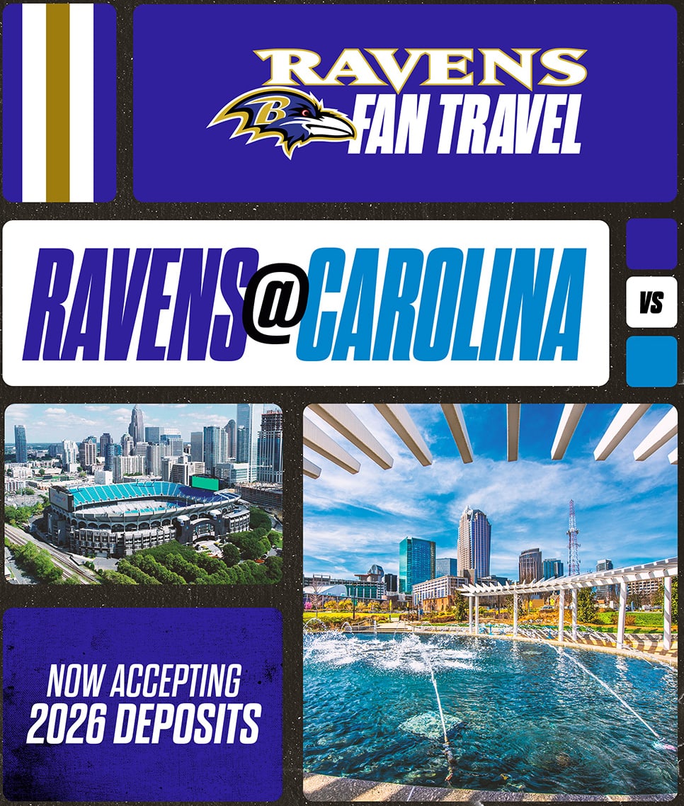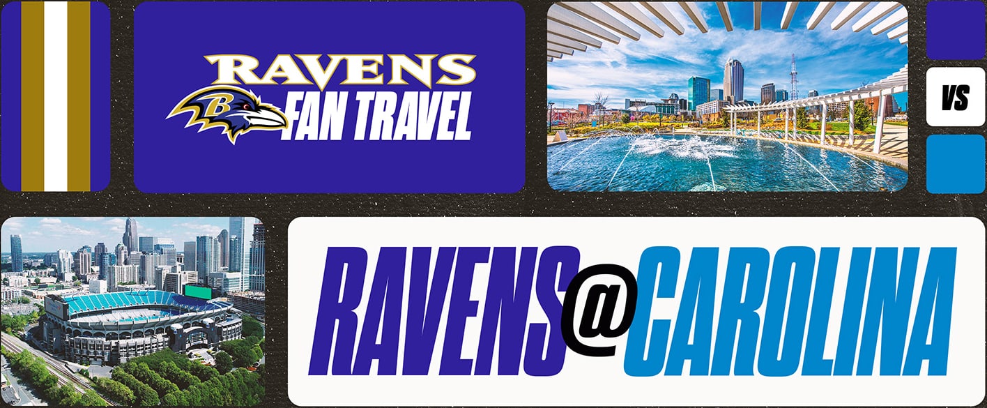 Our package includes round-trip flights from Baltimore to Charlotte, airport transportation, a three-night stay at a Downtown Charlotte hotel, a welcome happy hour to kick things off, a Ravens Pep Rally, an all-inclusive tailgate party with hundreds of fellow Ravens fans, a meet & greet with Baltimore Ravens alumni, round-trip transportation to the stadium, and upper-level game tickets.