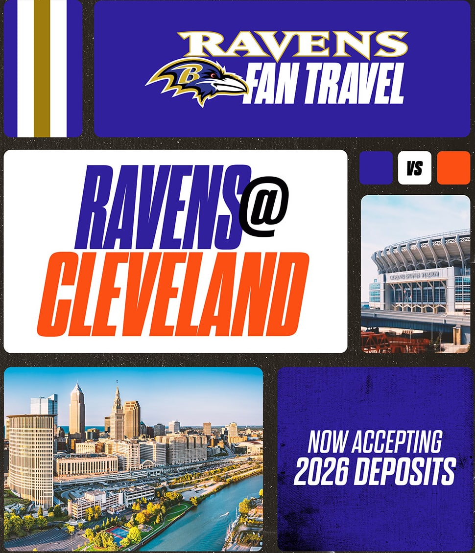 Our package includes round-trip bus from Baltimore to Cleveland, a two-night stay at a Downtown Cleveland hotel, a Ravens Pep Rally, an all-inclusive tailgate party with hundreds of fellow Ravens fans, a meet & greet with Baltimore Ravens alumni, round-trip transportation to the stadium, and upper-level game tickets.
